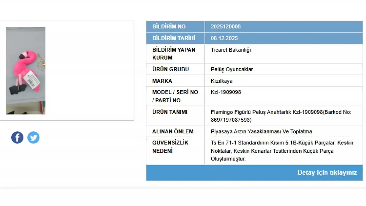 Güvensiz Ürün Bilgi Sistemi (GÜBİS) üzerinden kamuoyuna duyurulan Flamingo Figürlü Peluş Anahtarlık (Kzl-1909098(Barkod No: 8697197087598)) ile ilgili yapılan denetimlerde boğulma riski tespit edildi. Güvensizlik nedeni, ''Ts En 71-1 Standardının Kısım 5.1B-Küçük Parçalar, Keskin Noktalar, Keskin Kenarlar Testlerinden Küçük Parça Oluşturmuştur.'' şeklinde açıklandı.