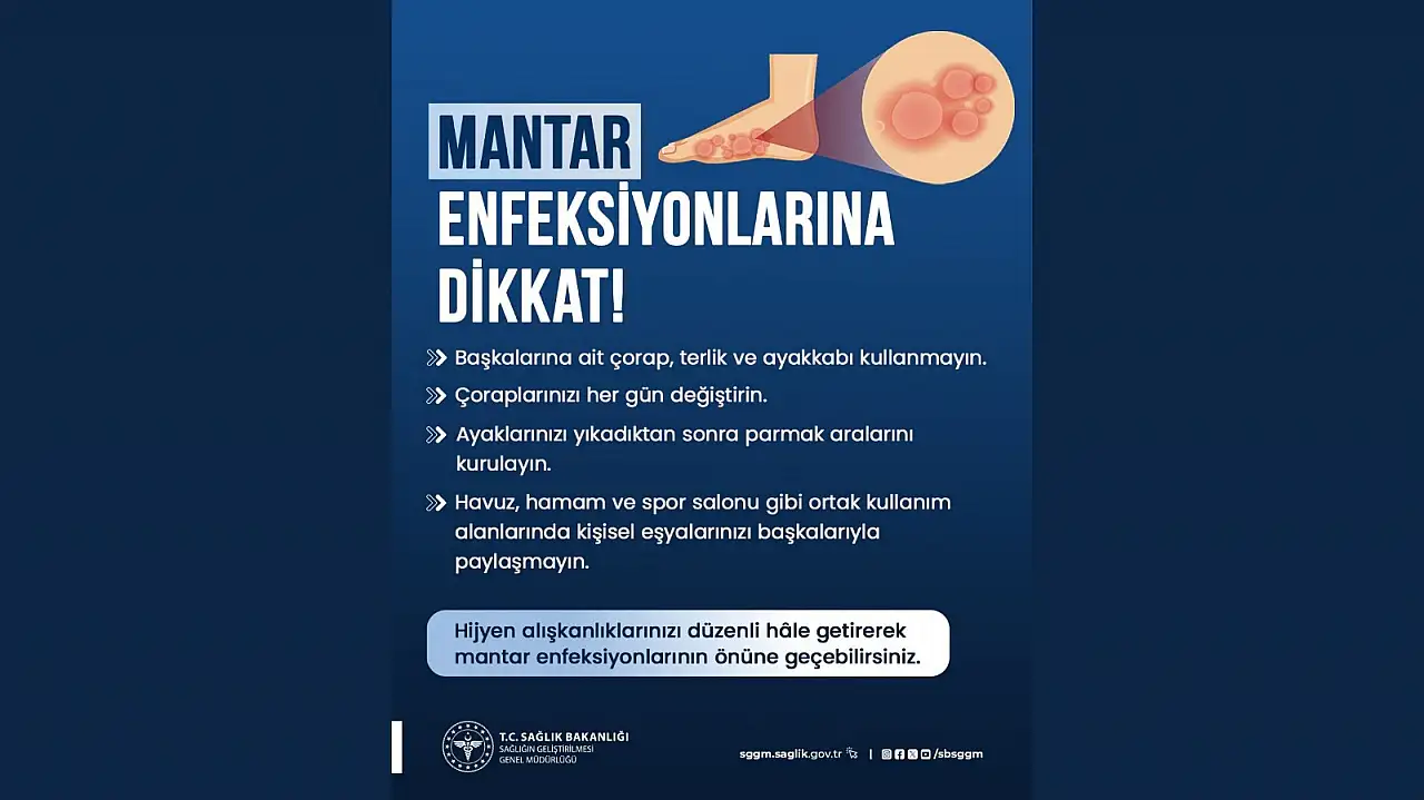 Bakanlık paylaşımda yer alan diğer öneriler şu şekilde: ‘’ Ayaklarınızı yıkadıktan sonra parmak aralarını kurulayın, havuz, hamam ve spor salonu gibi ortak kullanım alanlarında kişisel eşyalarınızı başkalarıyla paylaşmayın’’ Düzenli hijyen alışkanlıkları ile bu tehlikenin önüne geçilebileceği belirtildi.