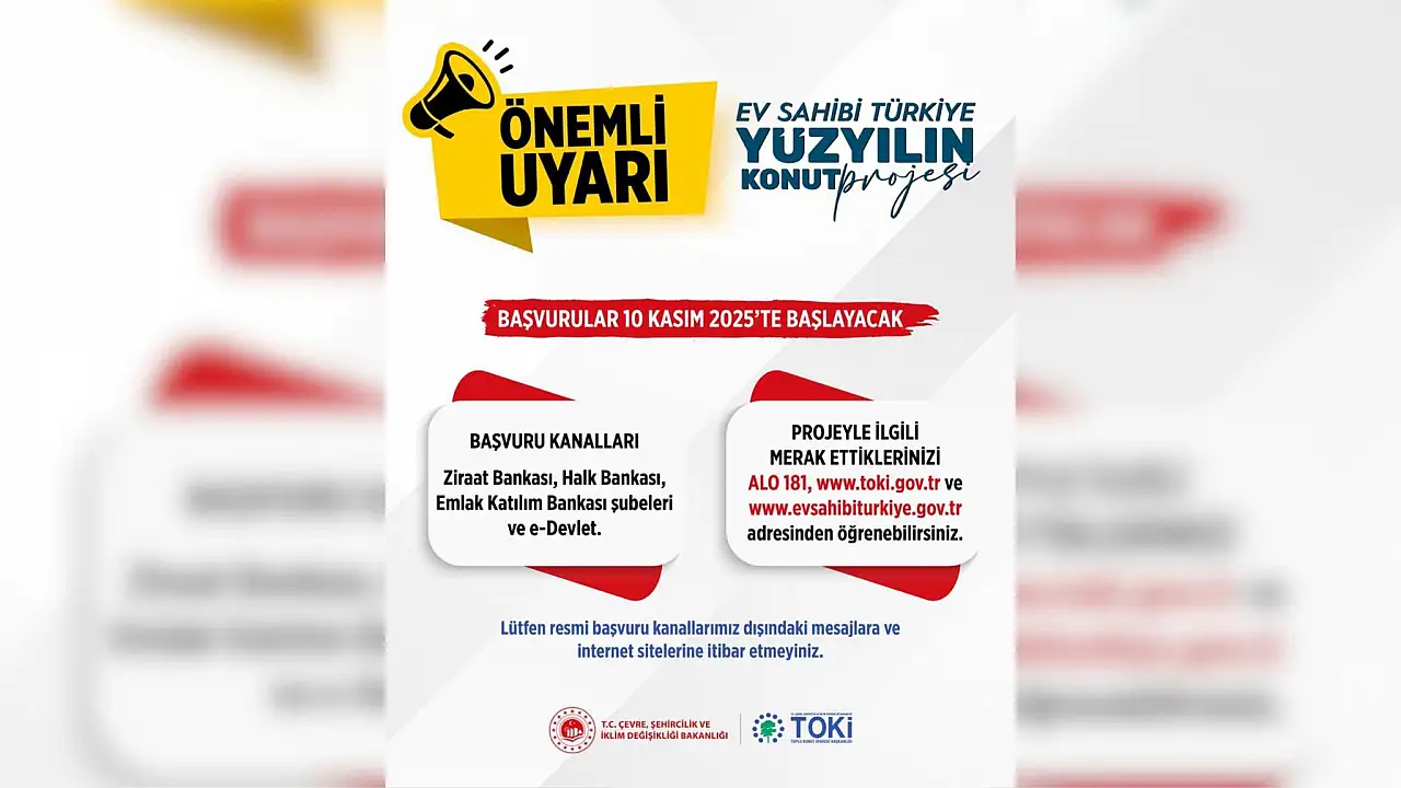 Bakanlıktan yapılan açıklamada, proje kapsamında vatandaşların konut sahibi olabilmesi için kolay ve güvenli başvuru yöntemleri oluşturulduğu vurgulanırken. Resmî başvuru kanalları dışında yapılan duyuru, mesaj veya internet sitelerine itibar edilmemesi gerektiği uyarısı yapıldı.