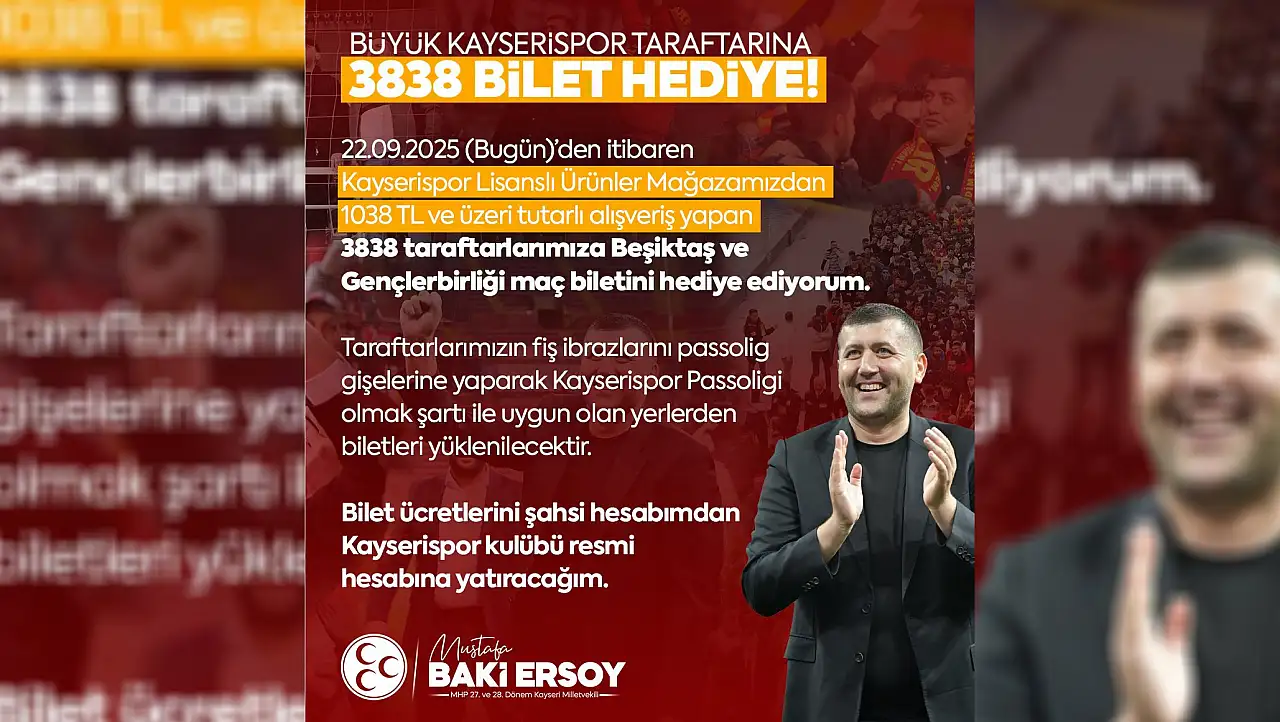 MHP Kayseri Milletvekili Baki Ersoy, hem Kayserispor ürünlerinin alınmasını hem de maçlara ilginin artması için daha önce de yaptığı gibi büyük bir jest yaptı. Ersoy, “Sen Yoksan Bir Kişi Eksiğiz” vurgusu yaparak, “22.09.2025 (Bugün)’den itibaren Kayserispor Lisanslı Ürünler Mağazamızdan 1038 TL ve üzeri tutarlı alışveriş yapan 3838 taraftarımıza Beşiktaş ve Gençlerbirliği maç biletini hediye ediyorum. Taraftarlarımızın uygun tarihli fiş ibrazlarını Passolig gişelerine yaparak, Kayserispor Passoligi olmak şartı ile uygun olan yerlerden biletleri yüklenecektir. Bilet ücretlerini şahsi hesabımdan Kayserispor Kulübü’nün resmi hesabına yatıracağım. Sen Yoksan Bir Kişi Eksiğiz… Sevdamız Kayserispor” ifadelerini kullandı.