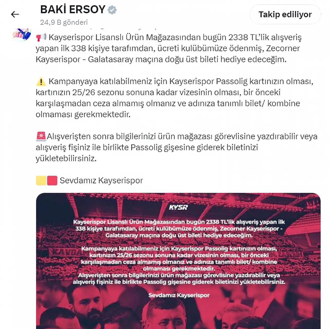 Geçtiğimiz sezon takımın kümede kalmasında büyük emek sarf eden Ersoy, bilet hediyesinin gün içinde olduğuna dikkat çekti. Passolig kartlarının vizelerinin yapılması ve gün içinde Kayserispor Lisanslı Ürün Mağazasından 2338 TL karşılığında bilet alınması durumunda hediye biletlerin geçerli olduğunu da aktaran Ersoy, “Kampanyaya katılabilmeniz için Kayserispor Passolig kartınızın olması, kartınızın 25/26 sezonu sonuna kadar vizesinin olması, bir önceki karşılaşmadan ceza almamış olmanız ve adınıza tanımlı bilet/ kombine olmaması gerekmektedir” ifadelerini kullandı.