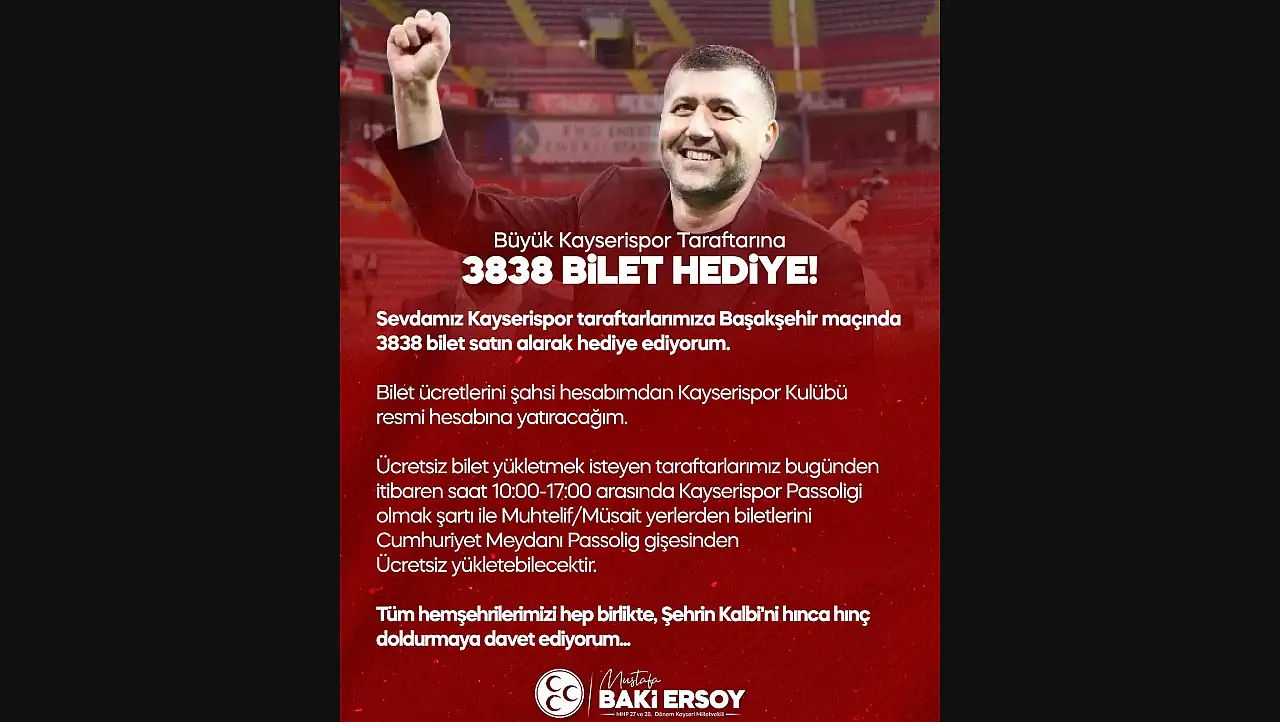 Baki Ersoy'dan Kayserispor için 3838 bilet hediyesi geldi. Başkan Nurettin Açıkalın ile birlikte 5 ayda 13 milyon Euro destek sağlayan Ersoy, Başakşehir maçı destek çağrısı da yaptı.