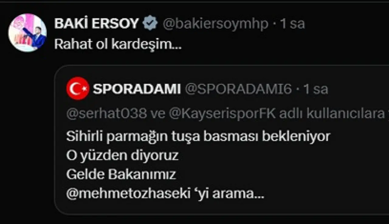 Kayserispor’a destek konusunda şehrin önde gelen isimlerinden olan Baki Ersoy da kendi isminin geçtiği bu yoruma cevap verdi. MHP Kayseri Milletvekili Baki Ersoy bu kullanıcıya “Rahat ol kardeşim” diyerek Kayserisporlu taraftarların gönlüne yeniden su serpti.