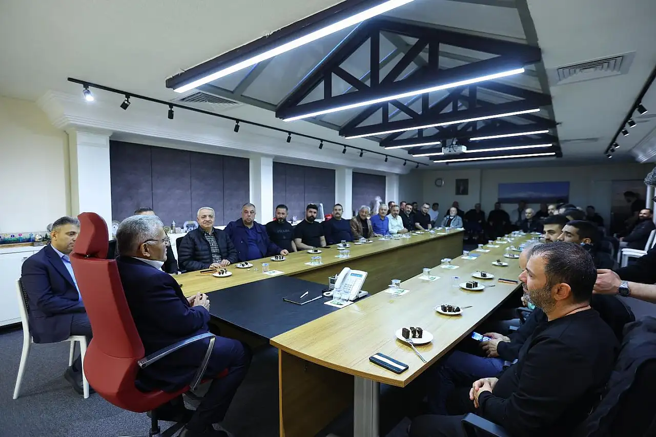 Büyükşehir Belediyesi Başkanlık Toplantı Salonu’nda gerçekleştirilen ziyarette, Yeraltı Çarşısı Yardımlaşma ve Dayanışma Derneği Başkanı Gökhan Gülen, dernek yönetimi ile esnaflar yer aldı.