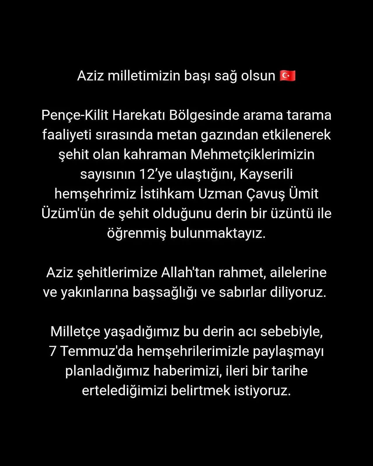 Kocasinan Belediye Başkanı Ahmet Çolakbayrakdar, Pençe-Kilit Harekâtı bölgesinde arama-tarama faaliyeti sırasında metan gazından etkilenerek şehit olan kahraman Mehmetçiklerimiz için bir mesaj yayımladı.