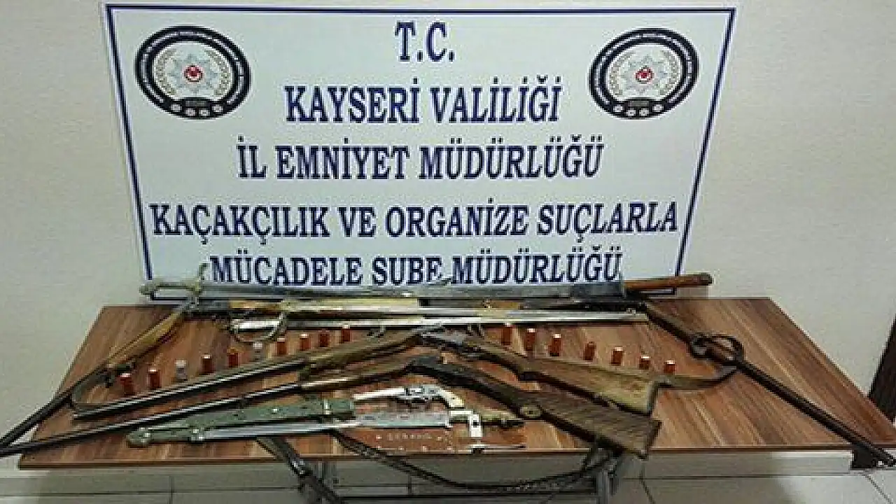 Kayseri polisi tarafından bir evde yapılan aramada 4 adet av tüfeği, 1 ruhsatsız tabanca, 17 adet dolu tüfek kartuşu, 3 adet kılıç ve 2 adet kama ele geçirildi.