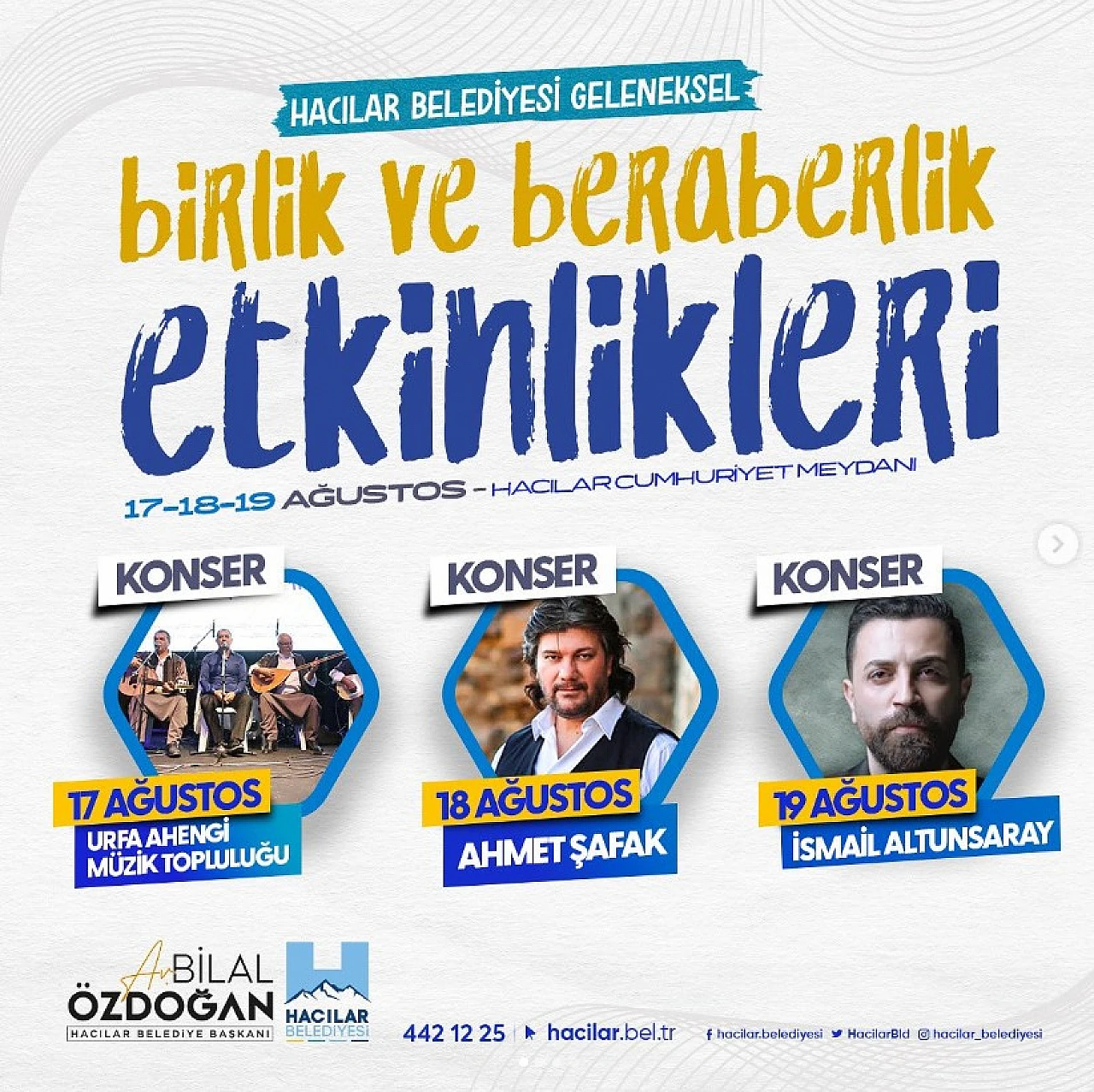 “Geleneksel Hacılar Birlik ve Beraberlik Etkinlikleri” başlıyor. Hacılar'da 3 gün süresince konser ve etkinlikler vatandaşla buluşacak. 17 Ağustos'ta başlayacak konserler 18 ve 19 Ağustos'ta da devam edecek.