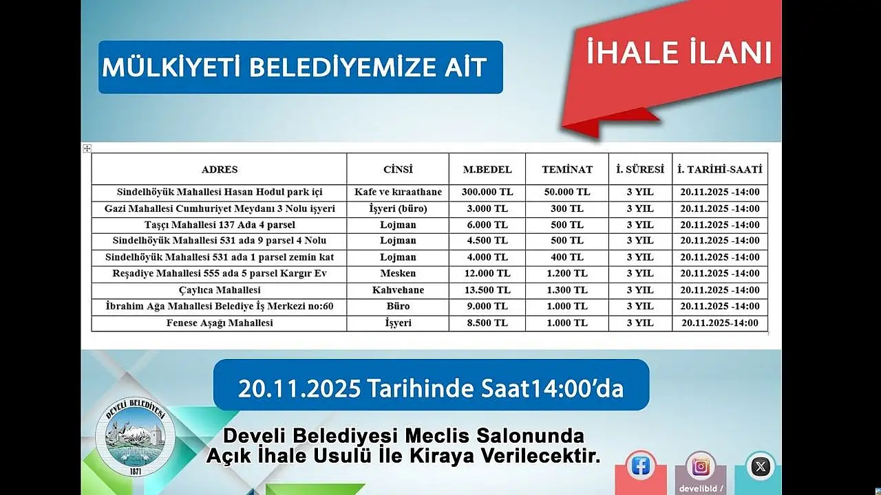 Develi Belediyesi tarafından duyurulan ihalede, farklı mahallelerdeki birçok taşınmazın kiralanması planlanıyor.