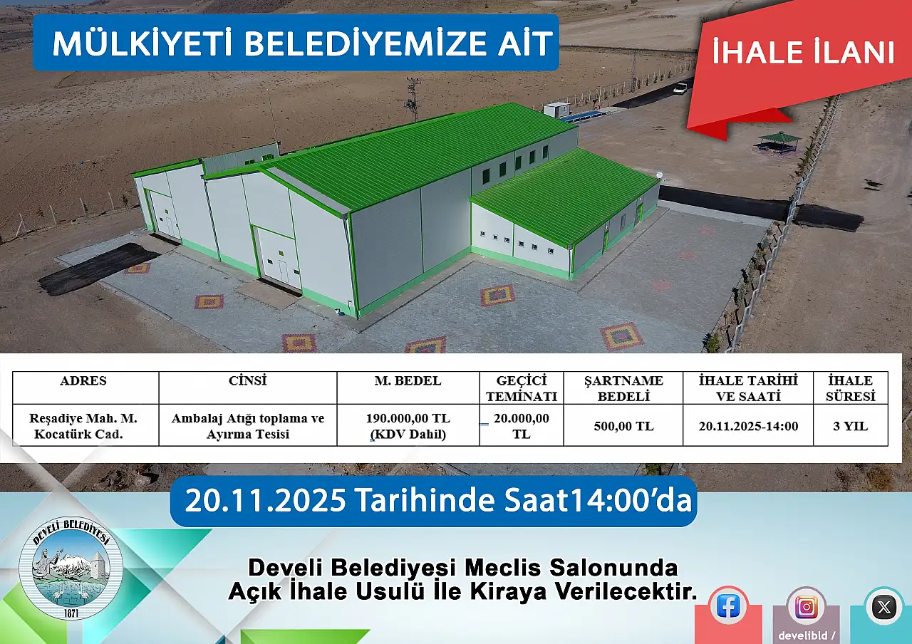 İhale listesinde bürodan kafeye, lojmandan ambalaj atığı tesisine kadar birçok farklı taşınmaz yer alıyor. En çok konuşulan kalemlerden biri ise Reşadiye Mahallesi Kocatürk Caddesi üzerindeki Ambalaj Atığı Toplama ve Ayırma Tesisi oldu. Tesisin muhammen bedeli 190 bin TL, geçici teminatı ise 20 bin TL olarak açıklandı.