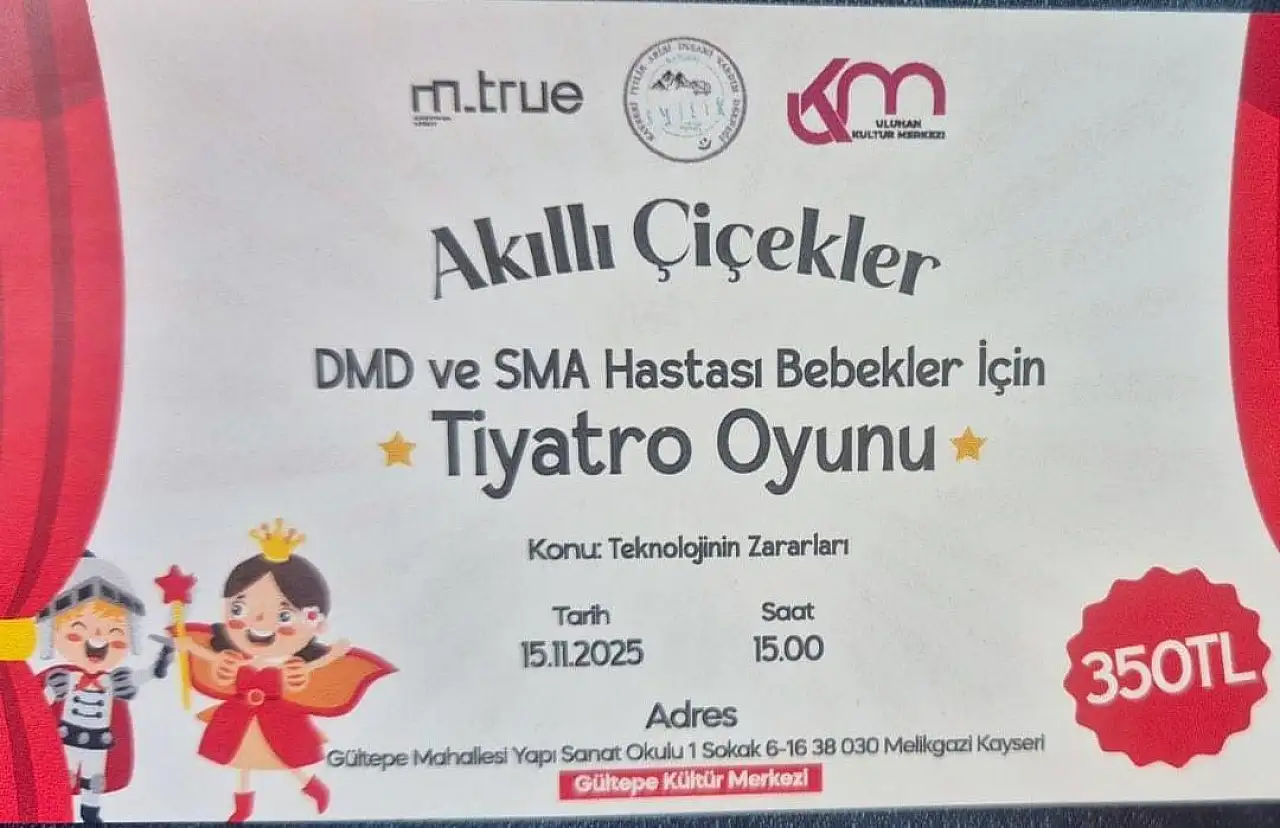 'Kayseri İyilik Abisi Derneği' tarafından 'Akıllı Çiçekler' tiyatro oyunu 15 Kasım Cumartesi günü saat 15.00'te Gültepe Kültür Merkezi'nde sahnelenecek. Hayırseverler tarafından satın alınacak oyun biletleri sayesinde şehit çocukları, yetim, öksüz ve ihtiyaç sahibi çocuklar oyunu ücretsiz olarak izleyebilecek.