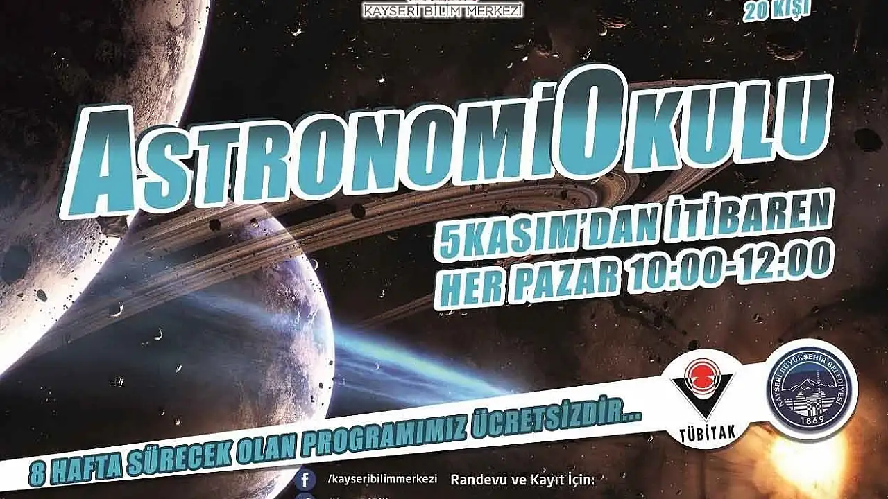 Kayseri Bilim Merkezi kapılarını astronomiye açıyor. Bilim Merkezi tarafından açılacak olan Astronomi Okulu 5 Kasım-24 Aralık tarihleri arasında her hafta pazar günleri eğitim verecek.