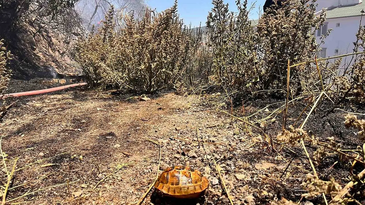 Ekiplerin soğutma çalışmaları sürerken yangında bir kaplumbağanın alevlere teslim olarak telef olduğu görüntülendi.