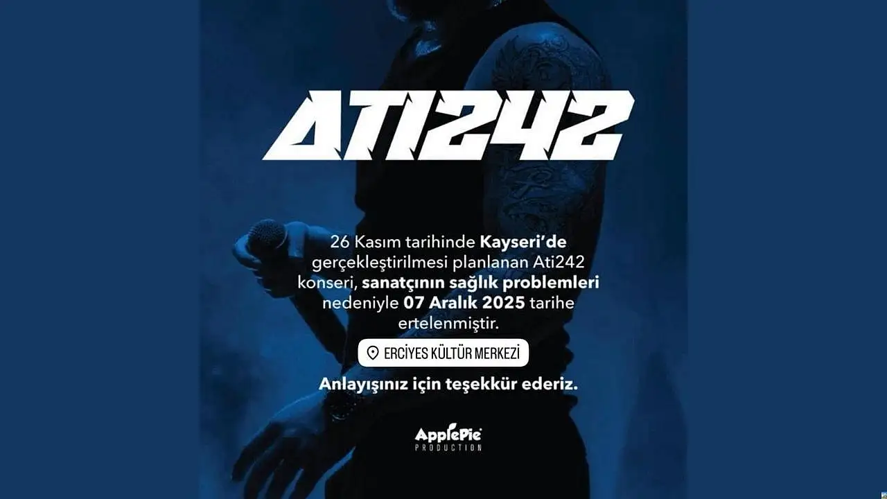 Organizasyon tarafından yapılan açıklamada, Ati242’nin bu akşam gerçekleştirilmesi planlanan konserinin sanatçının yaşadığı sağlık problemi nedeniyle iptal edildiği bildirildi. Etkinliğin 07 Aralık 2025 tarihine ertelendiği kaydedildi.
