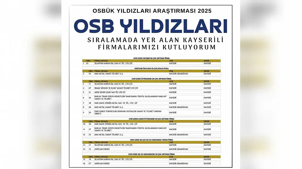 Organize Sanayi Bölgeleri Üst Kuruluşu (OSBÜK), her yıl düzenlediği ‘‘OSB Yıldızları’‘ araştırmasının 2025 sonuçlarını yayımladı. Türkiye genelindeki OSB’lerde performans artışlarını temel alan çalışmada, Kayseri’den farklı sektörlerde faaliyet gösteren firmalar dikkat çekici sonuçlar elde etti.