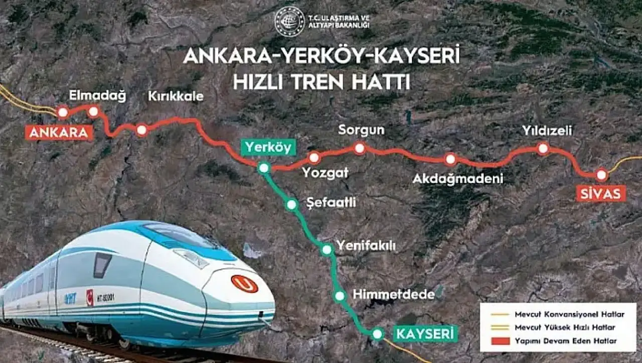Kayseri-Yerköy Yüksek Hızlı Tren (YHT) hattı, 2028 yılı içinde tamamlanarak test sürüşlerine başlanması planlanıyor. Bu proje ile Kayseri-Ankara arası seyahat süresi 7 saatten 2 saate, Kayseri-İstanbul arası ise 5,5 saate düşecek. Hattın toplam uzunluğu 142 kilometre olacak ve saatte 250 kilometre hızla hizmet verecek. Güzergâh boyunca Yerköy, Şefaatli, Yenifakılı ve Kayseri olmak üzere 4 istasyon bulunacak. Proje, yılda yaklaşık 13,3 milyon yolcu ve 90 milyon ton yük taşıma kapasitesine sahip olacak. Ulaştırma ve Altyapı Bakanı Abdulkadir Uraloğlu, Kayseri-Yerköy Yüksek Hızlı Tren hattının 2028 yılı içinde tamamlanarak test sürüşlerine başlanmasının planlandığını bildirdi.