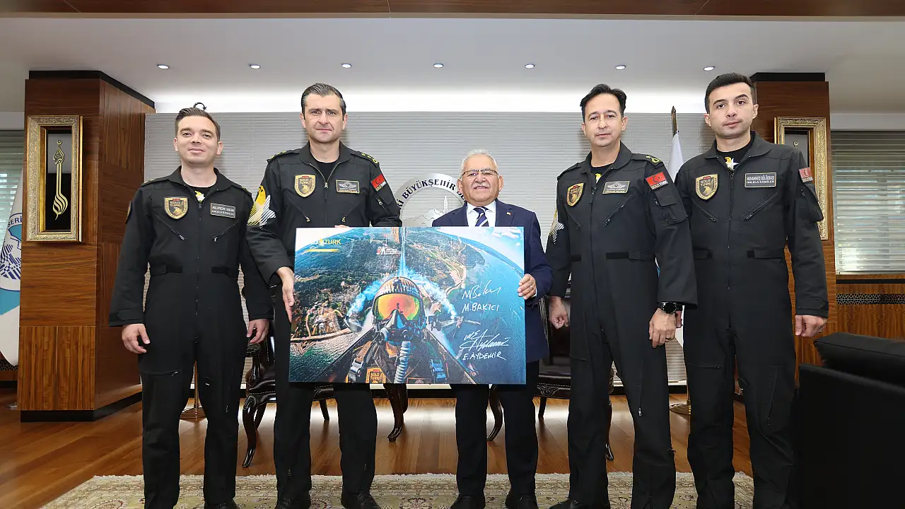 Kayseri Büyükşehir Belediye Başkanı Dr. Memduh Büyükkılıç, Türkiye’nin gururu SOLOTÜRK’ün 1. Pilotu Yarbay Murat Bakıcı ve Garnizon Komutanı Hava Pilot Tuğgeneral Hasan Volkan Güleryüz’ü başkanlık makamında ağırladı.