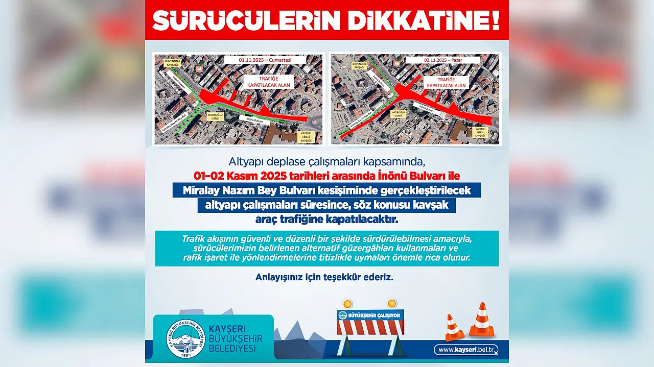Kayseri Büyükşehir Belediyesi tarafından yapılan duyuru kapsamına Düvenönü olarak bilinen İnönü Bulvarı'nı Şehit Şehit Miralay Nazım Bey Bulvarı'na bağlayan kavşak ve çıkan yollar trafiğe kapatılacak.