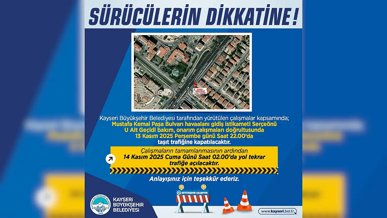 Kayseri Büyükşehir Belediyesi tarafından yürütülen çalışmalar kapsamında Mustafa Kemal Paşa Bulvarı üzerinden bulunan alt geçit geçici sürekliğine araç trafiğine kapatılacak. Detaylar Kayseri Anadolu Haber'de....
