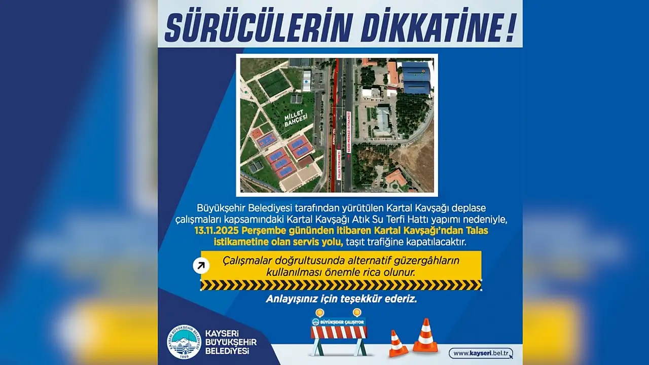 Yapılan açıklamada sürücülerin aksama yaşamaması için alternatif güzergahları kullanmaları önerildi. İşte o açıklama: ''Kartal Kavşağı’nda yürütülen Atık Su Terfi Hattı yapım çalışmaları kapsamında, 13 Kasım 2025 Perşembe gününden itibaren Kartal Kavşağı’ndan Talas istikametine giden servis yolu taşıt trafiğine kapatılacaktır. Trafik akışının aksamaması adına alternatif güzergahların kullanılmasını önemle rica ederiz. Anlayışınız için teşekkür ederiz.''