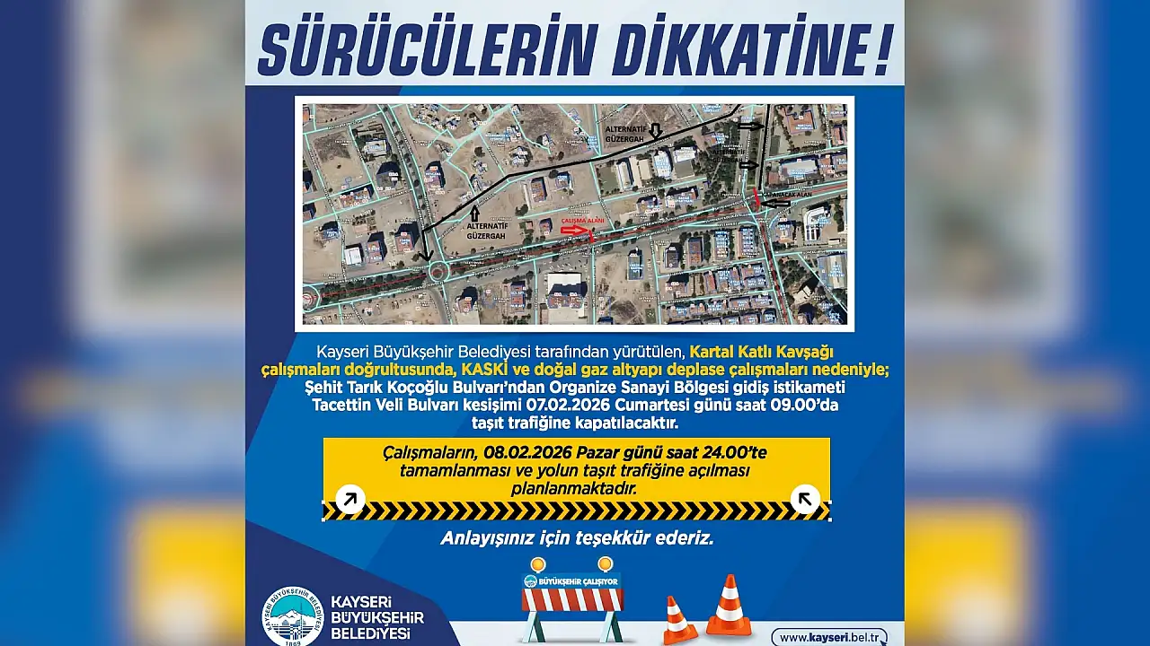 Kayseri Büyükşehir Belediyesi, Kartal Katlı Kavşak çalışmaları kapsamında Şehit Tarık Koçoğlu Bulvarı'nın bir kısmının araç trafiğine kapatılacağını duyurdu. Detaylar Kayseri Anadolu Haber'de...