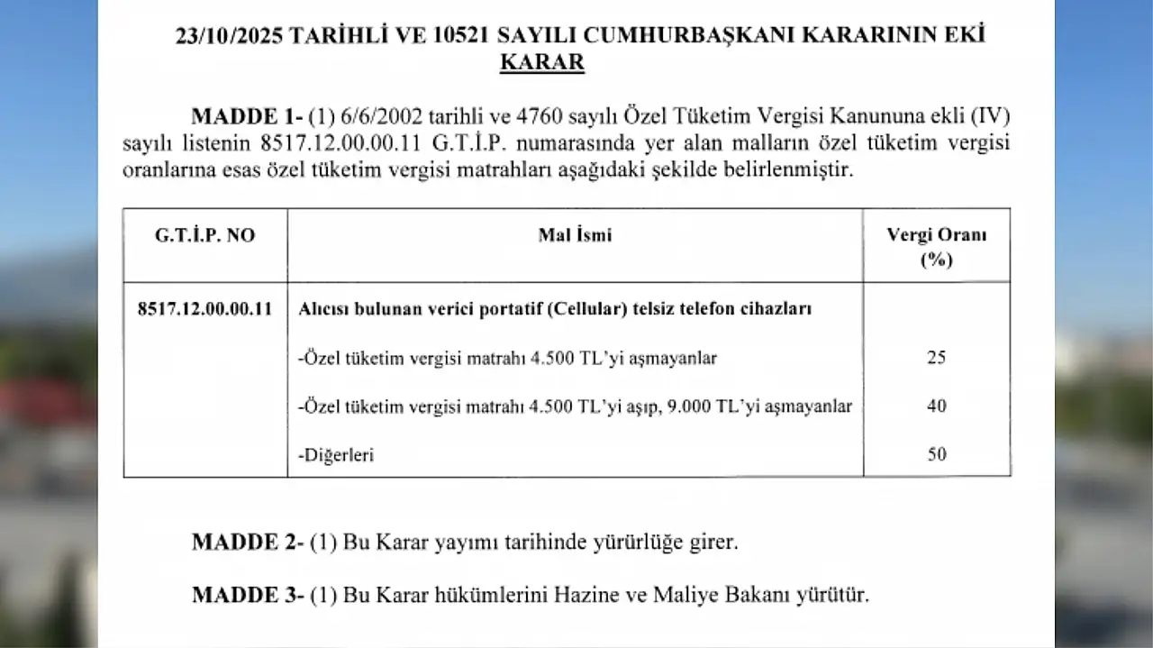 Cumhurbaşkanı Recep Tayyip Erdoğan imzasıyla yayımlanan karara göre cep telefonlarında uygulanan Özel Tüketim Vergisi oranların yeniden belirlendi. Cep telefonlarında uzun süredir ÖTV tahsilatları telefon fiyatlarında yaşanan artıştan dolayı üst dilimden uygulanıyordu.
