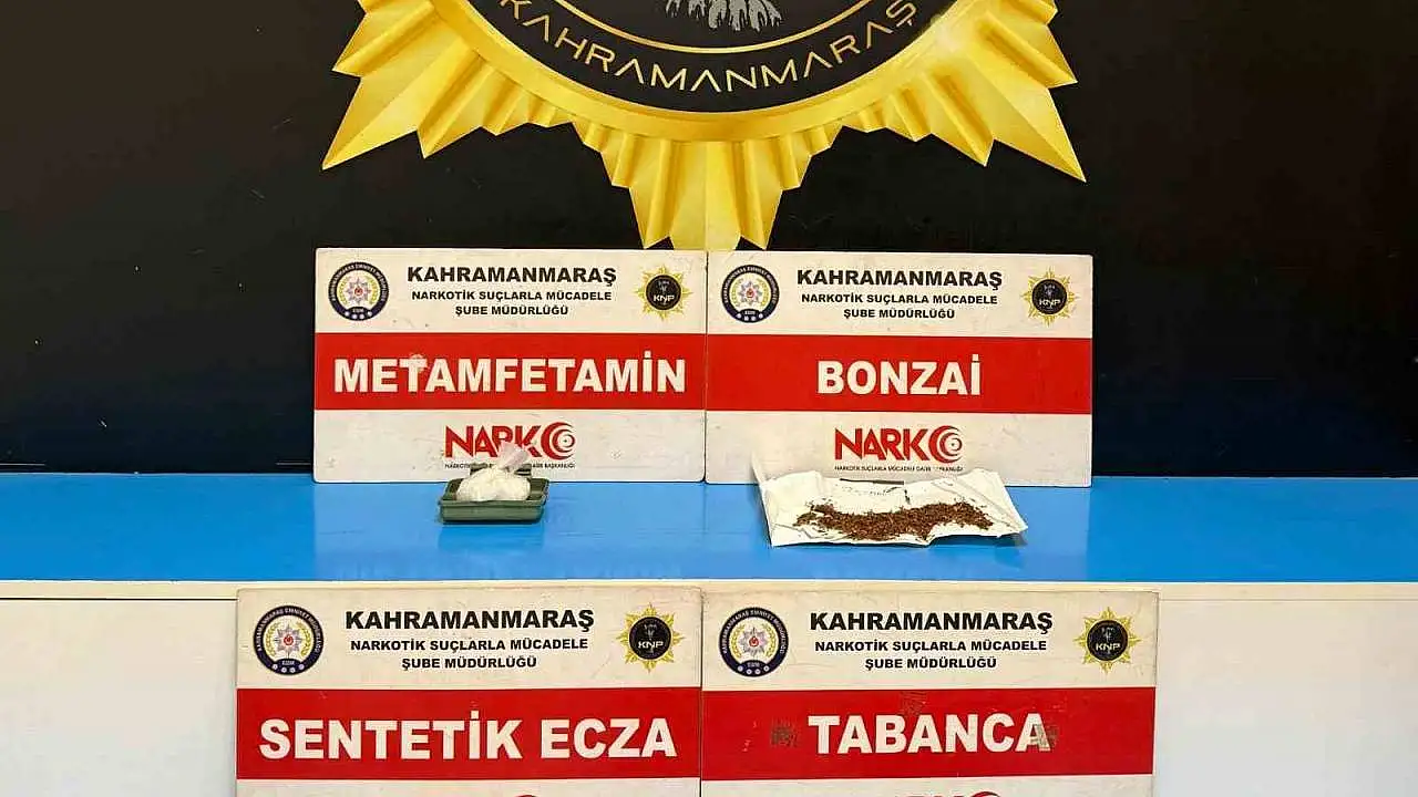 Yapılan aramalarda ise 47,25 gram esrar, 61,2 gram metamfetamin, 39,65 gram bonzai, 580 sentetik ecza, 105 kök hint keneviri, 4’ü tabanca, 8 silah ele geçirildi.