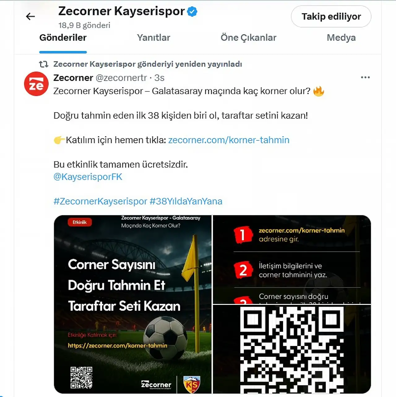 İş insanı Ziya Eren'in sahilbi olduğu Zecorner, yaptığı paylaşımla tüm dikkatleri üzerine topladı. Kayserispor'a verdiği destekle taraftarın gönlünde taht kuran Ziya Eren, farkındalık oluşturmaya devam ediyor. Zecorner firmasının resmi X hesabından yapılan paylaşımda, “Kayserispor - Galatasaray maçında kaç korner olur?” sorusu yöneltildi. Paylaşımda ayrıca, “Doğru tahmin eden ilk 38 kişiden biri ol, taraftar setini kazan!” ifadeleri yer aldı.