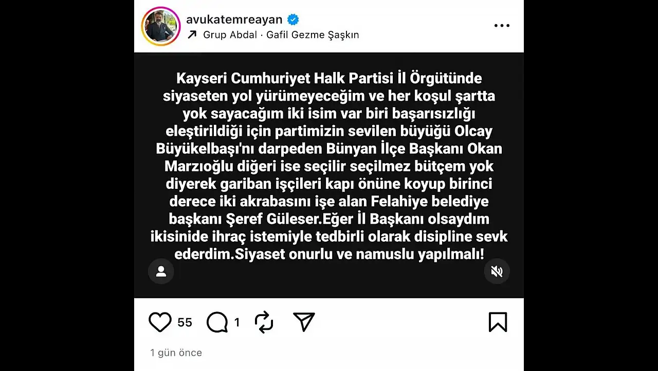 Sosyal medya hesabından paylaşım yapan Avukat Emre Ayan, ‘’Kayseri CHP İl Örgütünde siyaseten yol yürümeyeceğim ve her koşulda yok sayacağım iki isim var. Biri, başarısızlığı eleştirildiği için partimizin sevilen büyüğü Olcay Büyükelbaş’ı darp eden Bünyan İlçe Başkanı Okan Marzioğlu, diğeri ise ‘seçilir seçilmez bütçem yok’ diyerek gariban işçileri kapı önüne koyan ve birinci derece iki akrabasını işe alan Felahiye Belediye Başkanı Şeref Güleşer. Eğer İl Başkanı olsaydım ikisini de ihraç istemiyle tedbirli olarak disipline sevk ederdim. Siyaset onurlu ve namuslu yapılmalı!’’ ifadelerini kullandı.