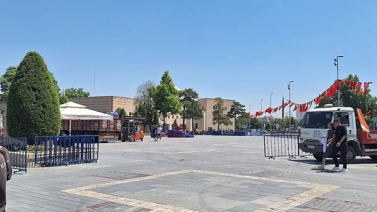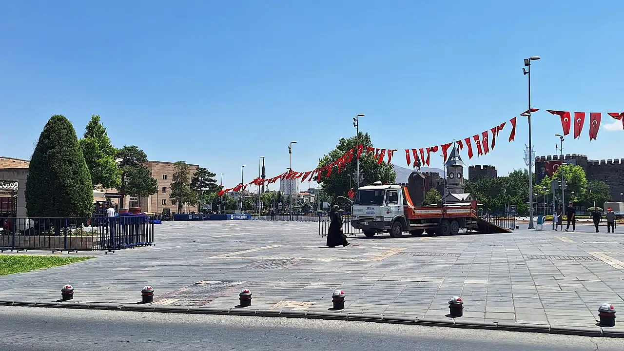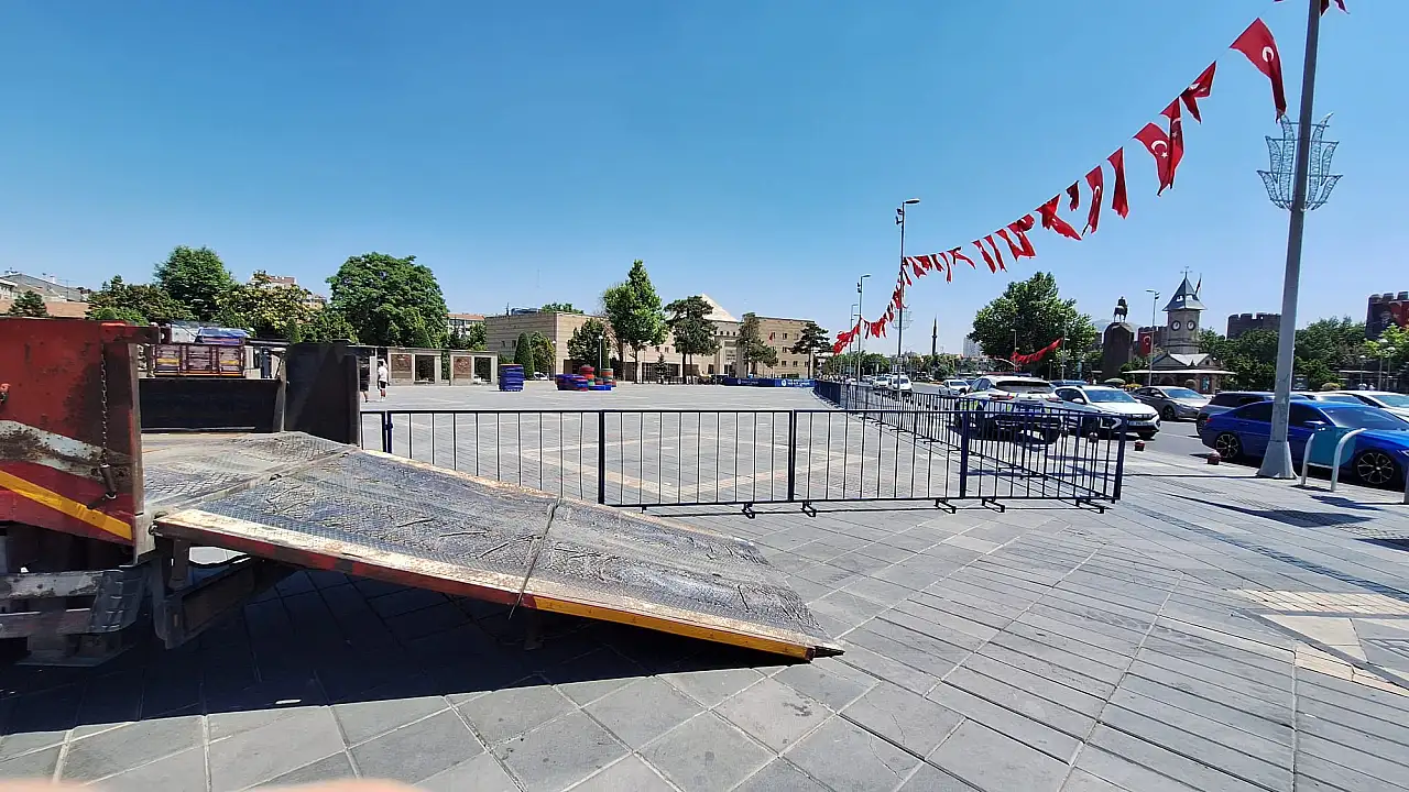 Kayseri'de Cumhuriyet Meydanı'nın bir bölümü, güvenlik önlemleri kapsamında kapatıldı. Polis ekipleri tarafından demir bariyerler yerleştirildi ve meydanda hazırlık çalışmaları hız kazandı. Vatandaşlar alanda yaşanan bu değişiklikleri dikkatle takip ediyor.