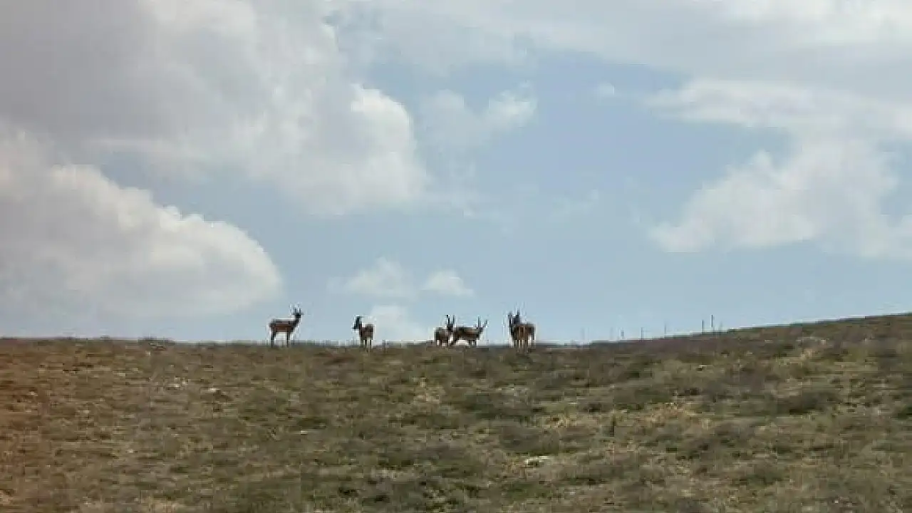 Doğada nadir görülen dağ keçileri, bir çiftçinin cep telefonu kamerasına yansıdı. Bozkırda görülen 6 dağ keçisi, kaçmak yerine poz verdi.