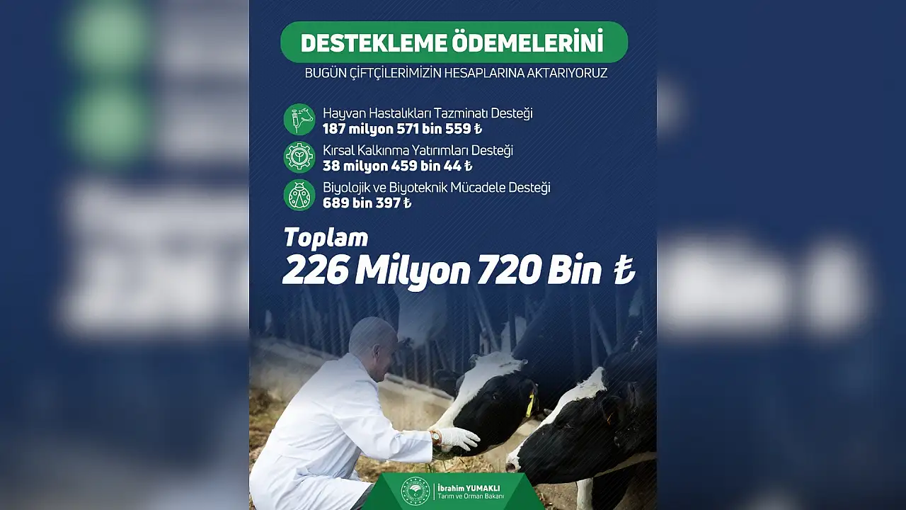 Tarım ve Orman Bakanlığı, çiftçilere yönelik destekleme ödemelerinin bugün itibarıyla hesaplara aktarılacağını duyurdu. Üretimin sürdürülebilirliğini sağlamak ve kırsal kalkınmayı desteklemek amacıyla yapılan ödemelerin toplam tutarı 226 milyon 720 bin lira oldu.