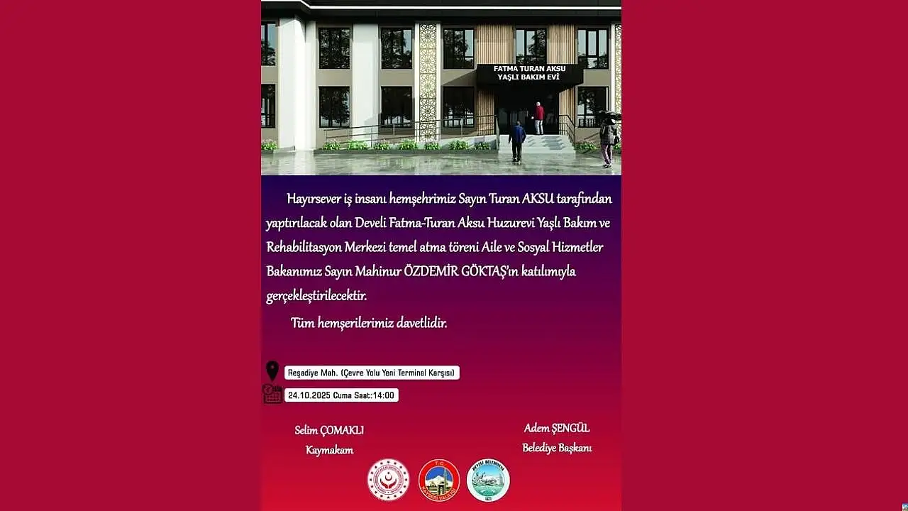 İlçede kısa süre önce hazırlıkları tamamlanan Fatma–Turan Aksu Huzurevi Yaşlı Bakım ve Rehabilitasyon Merkezi için temel atma töreni düzenlenecek. Aile ve Sosyal Hizmetler Bakanı Mahinur Özdemir Göktaş’ın da katılacağı tören, 24 Ekim Cuma günü (yarın) saat 14.00’te Reşadiye Mahallesi’nde (Çevre Yolu Yeni Terminal karşısında) gerçekleştirilecek.