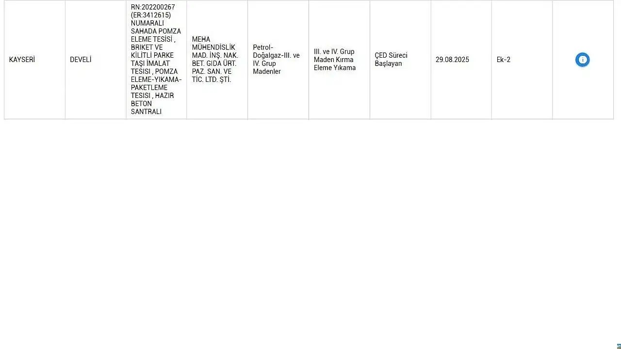 ÇED süreci kapsamında, tesislerin çevreye olası etkileri değerlendirilecek, ilgili kurumlar görüş bildirecek ve kamuoyu bilgilendirilecek. Projede ayrıca III. ve IV. grup maden kırma, eleme ve yıkama faaliyetleri de bulunuyor.
