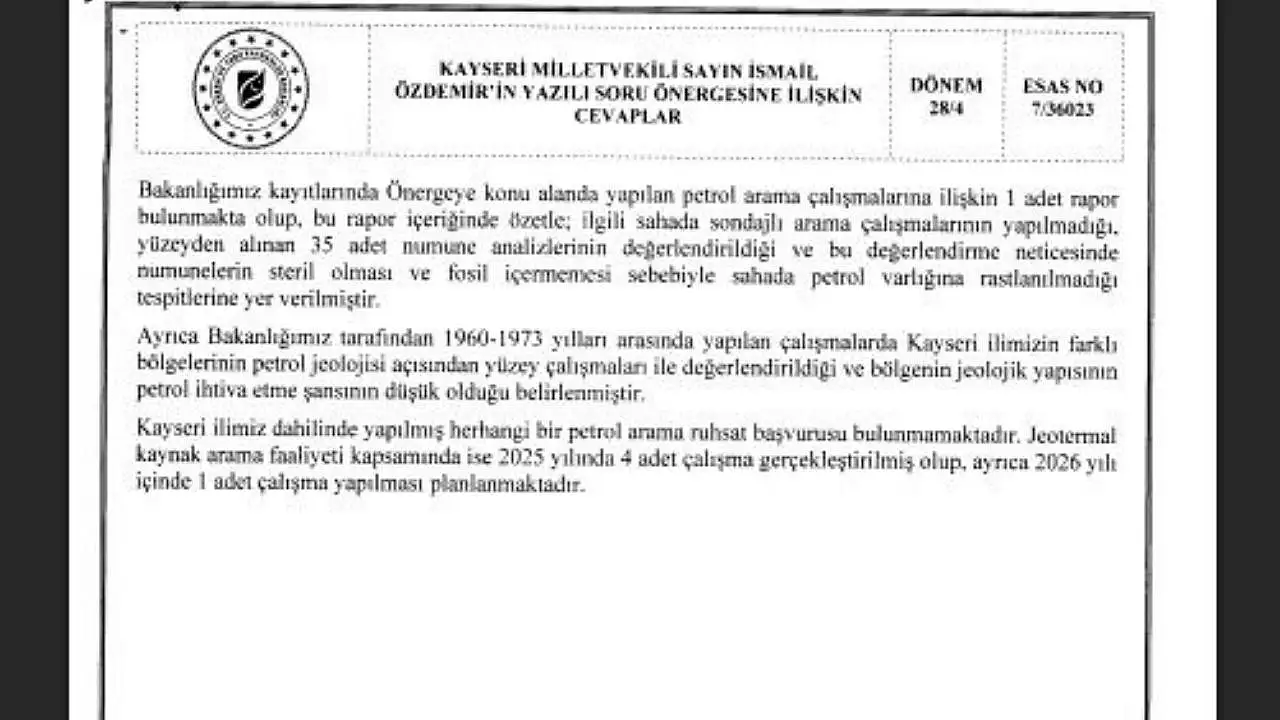 Ayrıca Özdemir, söz konusu çalışmalara ait resmî raporlar, laboratuvar analizleri ve saha kayıtlarının bulunup bulunmadığını, bölgenin yeniden petrol arama faaliyetlerine dâhil edilip edilmeyeceğini ve 2025–2026 yılları için Kayseri genelinde planlanan petrol, doğal gaz ve jeotermal çalışmaların kapsamını da Bakanlığa yönelttiği sorular arasında dile getirmişti.