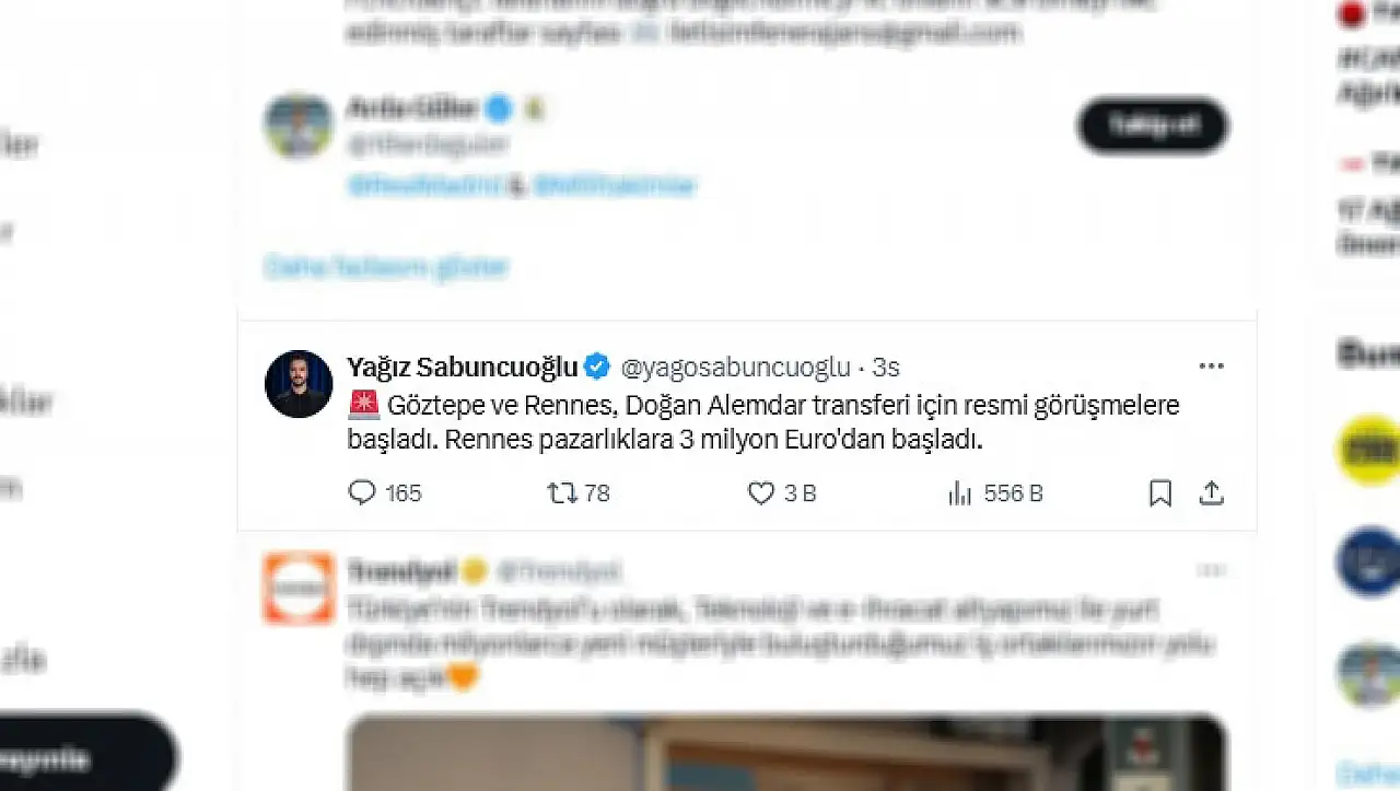 Sabuncuoğlu, “Göztepe ve Rennes, Doğan Alemdar transferi için resmi görüşmelere başladı. Rennes pazarlıklara 3 milyon Euro'dan başladı” bilgisini paylaştı. Eğer Doğan Alemdar Göztepe ile anlaşma sağlarsa, ilk maçında eski takımı Kayserispor’a karşı forma giyecek.