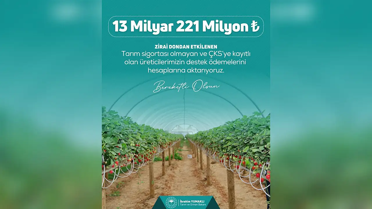 Türkiye genelinde zirai don nedeniyle büyük zarar gören üreticilere yönelik beklenen adım geldi. Tarım ve Orman Bakanı İbrahim Yumaklı, sosyal medya hesabından yaptığı açıklamayla, tarım sigortası olmayan ancak Çiftçi Kayıt Sistemi’ne (ÇKS) kayıtlı üreticilere 13 milyar 221 milyon liralık destek ödemesi yapılacağını duyurdu.