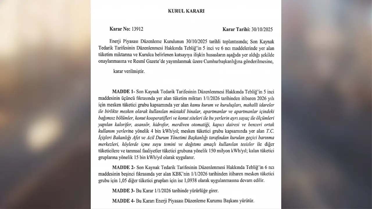 Enerji Piyasası Düzenleme Kurulu tarafından yapılan toplantıda Son Kaynak Tedarik Tarifesinin Düzenlenmesi Hakkında Tebliğ'de değişiklik yapılmasına karar verildi.
