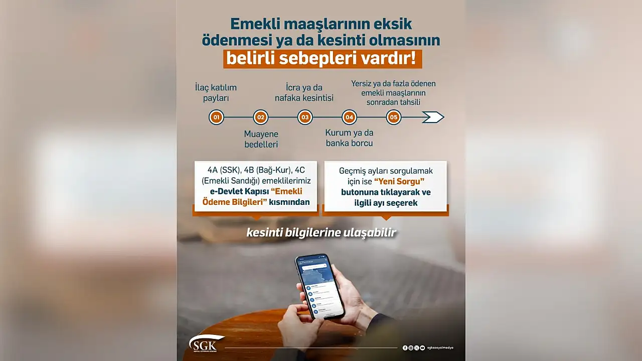Sosyal Güvenlik Kurumu tarafından yapılan sosyal medya paylaşımına göre emekli vatandaşların emekli maaşlarında bazı zamanlarda yaşanan kesintiler veya eksik ödemelerinin nedenlerine ilişkin bilgilendirme yapıldı. Yapılan paylaşımda olası nedenler sıralandı.