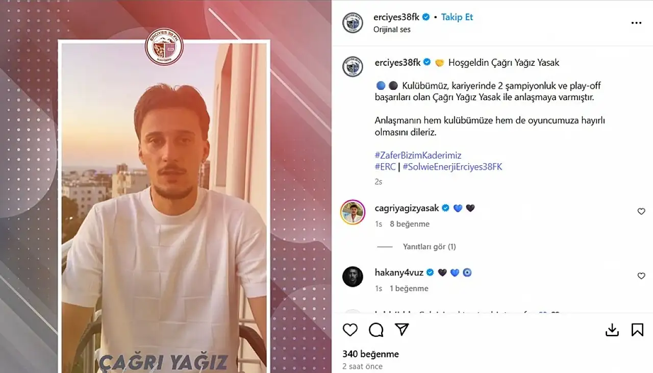 Erciyes 38 FK’nın yeni transferi Çağrı, videolu bir mesaj gönderdi. Mesajda şampiyonluktan bahseden Yasak, ‘’Merhaba Kayseri, Şampiyonluk için ben de sizinleyim. Başarılarla dolu bir sezon geçirip, günün sonunda şampiyonluğa ulaşmak için yakında ordayım. Görüşmek üzere…'' ifadelerini kullandı.