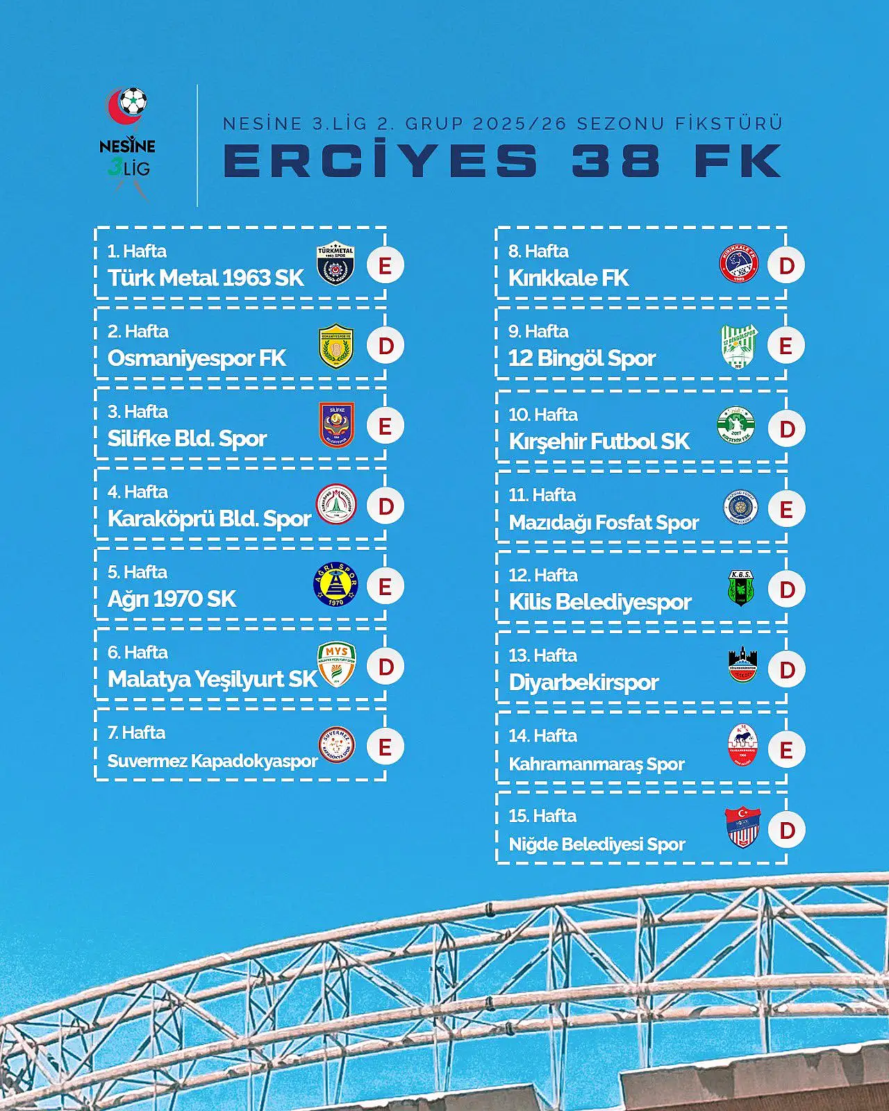 Erciyes 38 FK sezonu Türk Metal 1963 SK maçıyla evinde açacak. Ligin son maçında ise yine evinde Niğde Belediyesi Spor ile karşılaşacak.