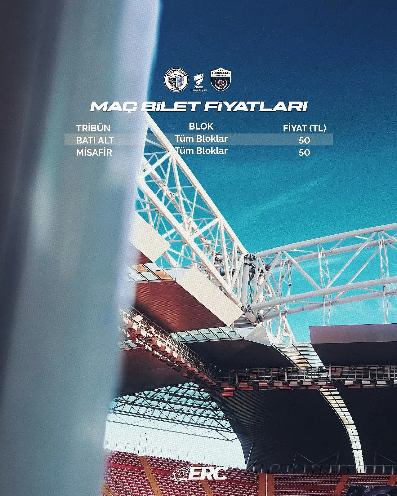 Erciyes 38 FK'dan yapılan açıklamada şu ifadelere yer verildi; "Takımımızın, Ziraat Türkiye Kupası 1. Eleme Turunda Türk Metal 1963 Spor ile RHG Enertürk Enerji Stadyumu’nda oynayacağı karşılaşmanın biletleri yarın saat 11.00'de Passo tarafından sunulacak.