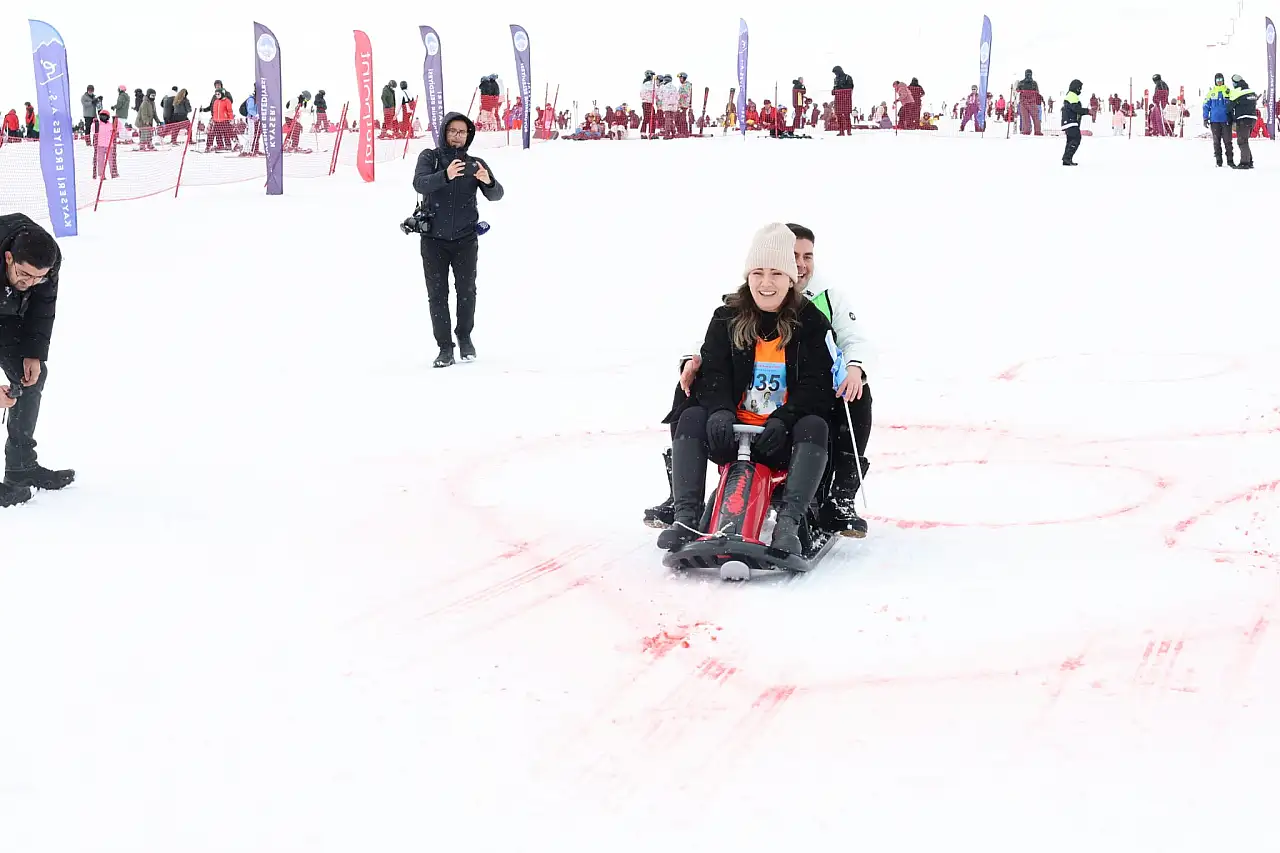 Türkiye'nin önemli kış turizm merkezlerinden Erciyes Kayak Merkezi'nde 14 Şubat Sevgililer Gününde eşler arası ‘Artık çekilmez oldun’ kızak yarışması yapıldı.