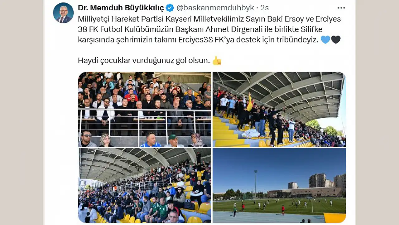 Doktor Başkan, maç bitiminde “Son dakikalarda attığı gol ile haftayı bir puan ile kapatan Erciyes 38 FK’mızı tebrik ediyor, önümüzdeki maçlarda başarılar diliyorum” diyerek sosyal medya hesabından Mavi-Siyah kalp atarken, öncesinde de “Milliyetçi Hareket Partisi Kayseri Milletvekilimiz Sayın Baki Ersoy ve Erciyes 38 FK Futbol Kulübümüzün Başkanı Ahmet Dirgenali ile birlikte Silifke karşısında şehrimizin takımı Erciyes 38 FK’ya destek için tribündeyiz. Haydi çocuklar vurduğunuz gol olsun” paylaşımı yaptı.