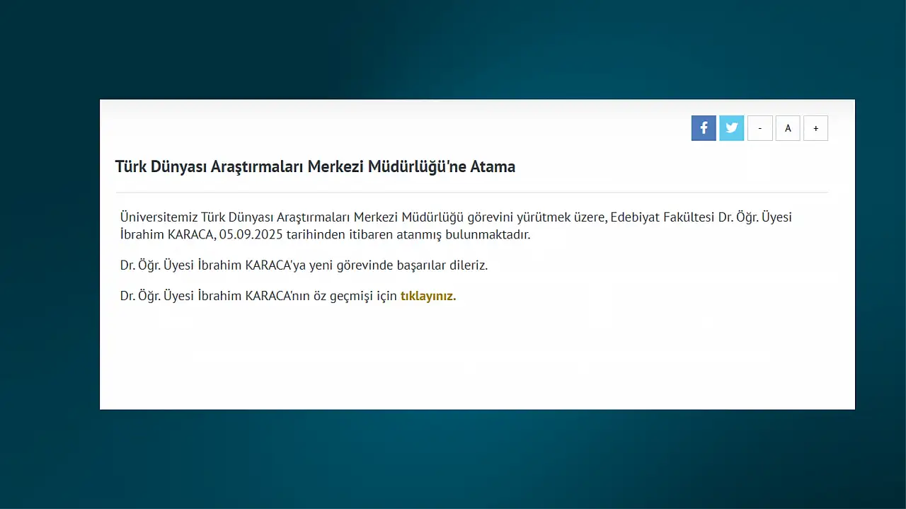 Üniversite tarafından yapılan açıklamada: ‘’Üniversitemiz Türk Dünyası Araştırmaları Merkezi Müdürlüğü görevini yürütmek üzere, Edebiyat Fakültesi Dr. Öğr. Üyesi İbrahim Karaca, 05.09.2025 tarihinden itibaren atanmış bulunmaktadır. Dr. Öğr. Üyesi İbrahim Karaca'ya yeni görevinde başarılar dileriz'' ifadelerine yer verildi.