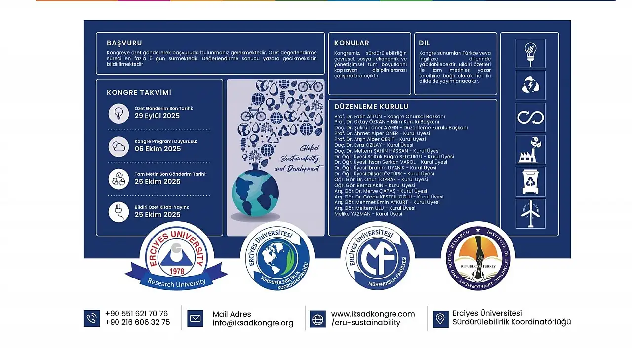 Erciyes Üniversitesi yayınladığı duyuru ile Uluslararası Küresel Sürdürülebilirlik ve Kalkınma Kongresi'ne ev sahipliği yapacağını duyurdu. İşte tarih ve tüm detaylar...