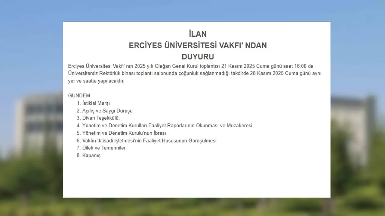Erciyes Üniversitesi Vakfı tarafından yayımlanan ilana göre vakfın 2025 yılı faaliyetlerin görüşülmesi için Olağan Genel Kurul Toplantısı gerçekleştirilecek.