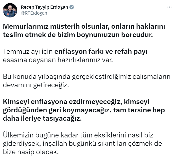 "Memurlarımız müsterih olsunlar" diyen Erdoğan, temmuz ayı için enflasyon ve refah payı esasına dayanarak gerekli çalışmaların yapılacağını söyledi.