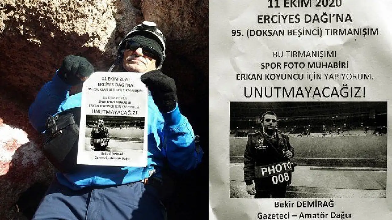 Kayserili gazeteci- amatör dağcı Bekir Demirağ (74) spor sahalarından arkadaşı olan merhum Erkan Koyuncu anısına Erciyes Dağı'nın 3.916 metre yükseklikteki zirvesine başarılı bir tırmanış yaptı.