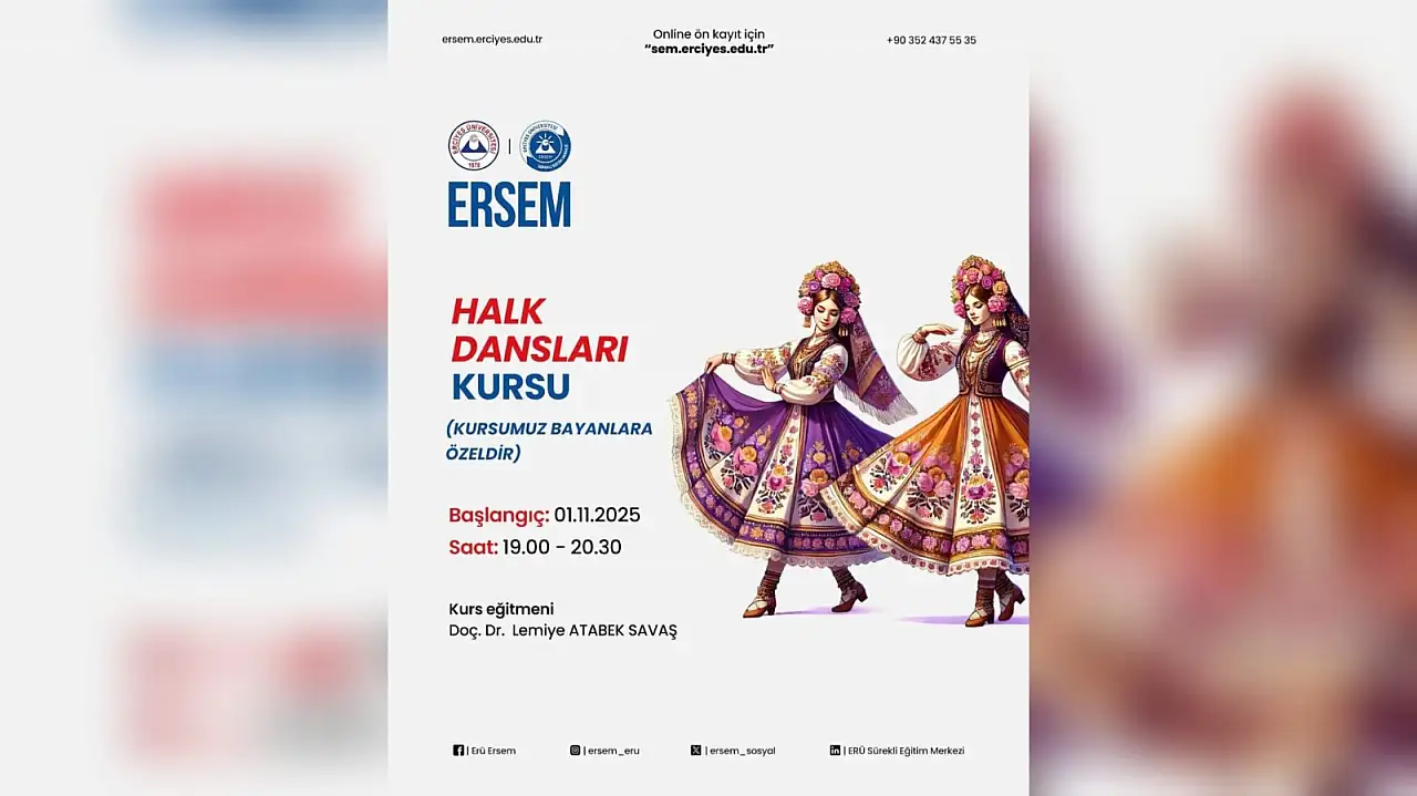 Erciyes Üniversitesi Sürekli Eğitim Merkezi (ERSEM), kadınlara özel yepyeni bir kursla kültür ve ritmi bir araya getiriyor. Anadolu’nun geleneksel halk danslarını modern bir bakışla yaşatacak Halk Dansları Kursu, 1 Kasım 2025’te başlıyor.
