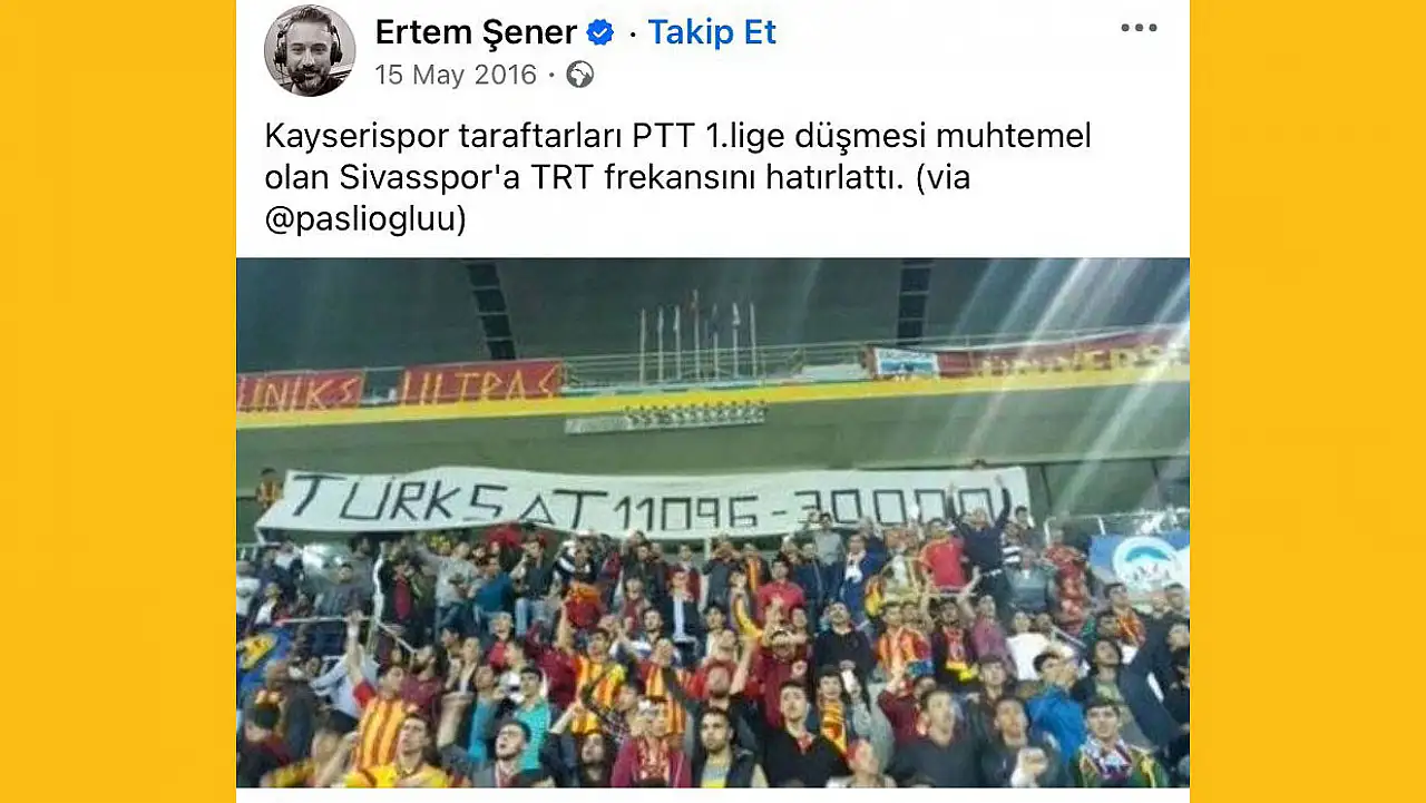 Sarı-Kırmızılı kulübün taraftarlarının 2016 yılında açtığı pankartı spor spikeri ve TV program sunucusu Ertem Şener de paylaşmıştı. Kayseri’nin parlayan yıldızı Abdulkadir Paslıoğlu’nun paylaşımını via olarak paylaşan Şener, şu ifadeleri kullanmıştı: “Kayserispor taraftarları PTT 1. Lig’e düşmesi muhtemel olan Sivasspor’a TRT frekansını hatırlattı. (via @paslioğlu.”
